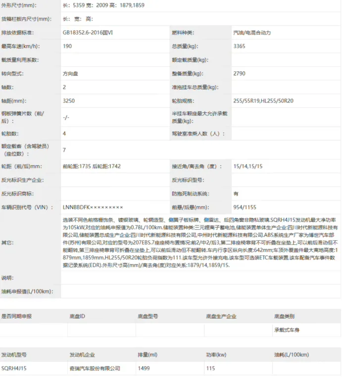 申报信息显示,V9车长5359mm,轴距3250mm,采用7座布局,动力为插电式增程混合动力,电池由宁德时代供应,提供三元锂与磷酸铁锂双版本。车身高度有两种(1859mm/1879mm),或对应不同配置车型。