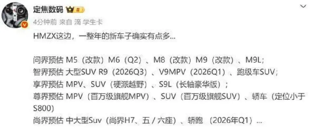 2026年,他们更要放大招。问界品牌直接给多款车型搞小改款,说白了就是“再优化一点,让你用得更爽”。智界V9已经官宣了,这MPV据说比商务车还舒服,第三季度还要推新款大型SUV智界R9,甚至还有跑车级SUV在路上。我表弟昨天刚试驾智界V9,回来就喊:“这车后座能躺平,孩子在后面看动画片,我坐前面跟在家似的!”