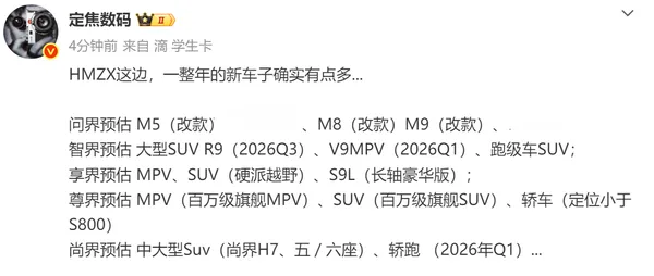 2025年,鸿蒙智行阵营累计交付新车约60万辆,彻底站稳中国造车新势力前列,旗下多款车型如问界M9、问界M8、问界M7、智界R7均达成月交付过万的成绩,高端车型尊界S800已成为中国汽车行业百万级的标杆产品。而近日,CNMO注意到,有博主发布预告,披露了2026年鸿蒙智行可能的新车产品阵容: