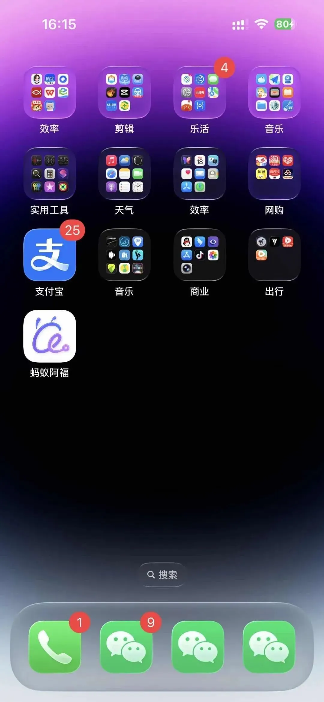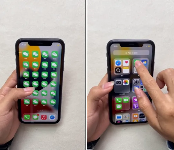 就是把“微信”从“ App 资源库”中,拖出来,这样就能实现桌面有两个,甚至一整屏的“微信”,相当壮观了!