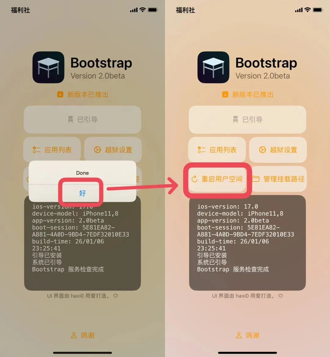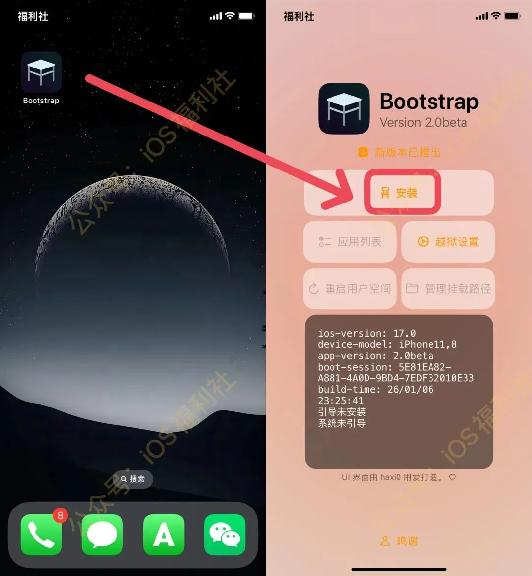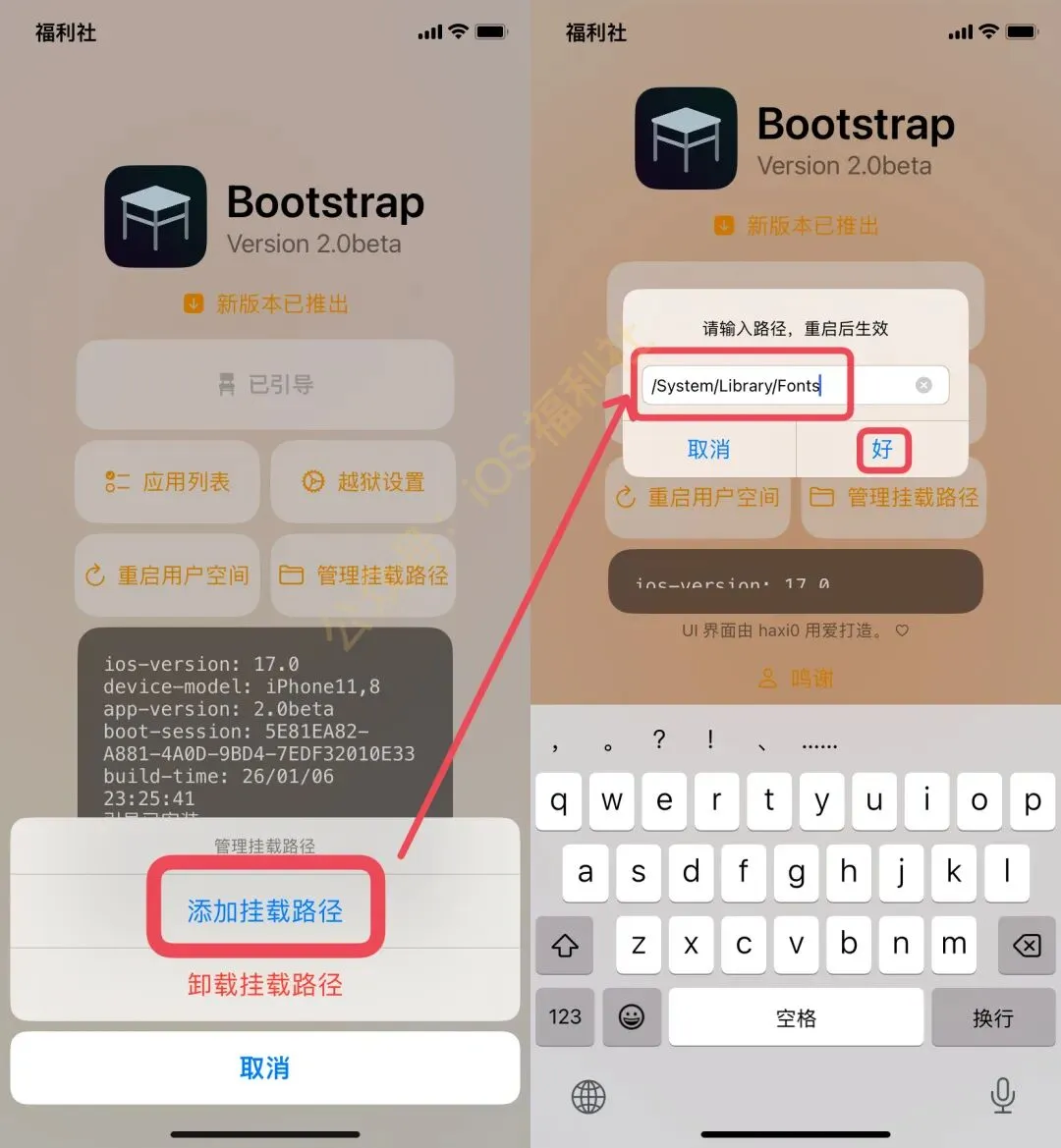 近日,iOS半越狱工具 Bootstrap_2.0 Beta开始内测,真皮大佬也同步更新,支持挂载,iOS17.0系统可以更换全局字体了!