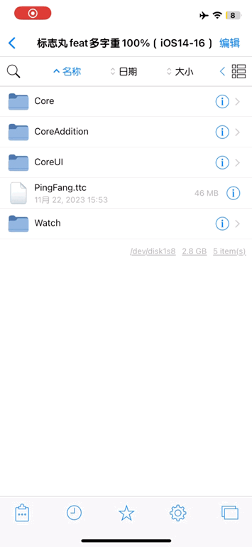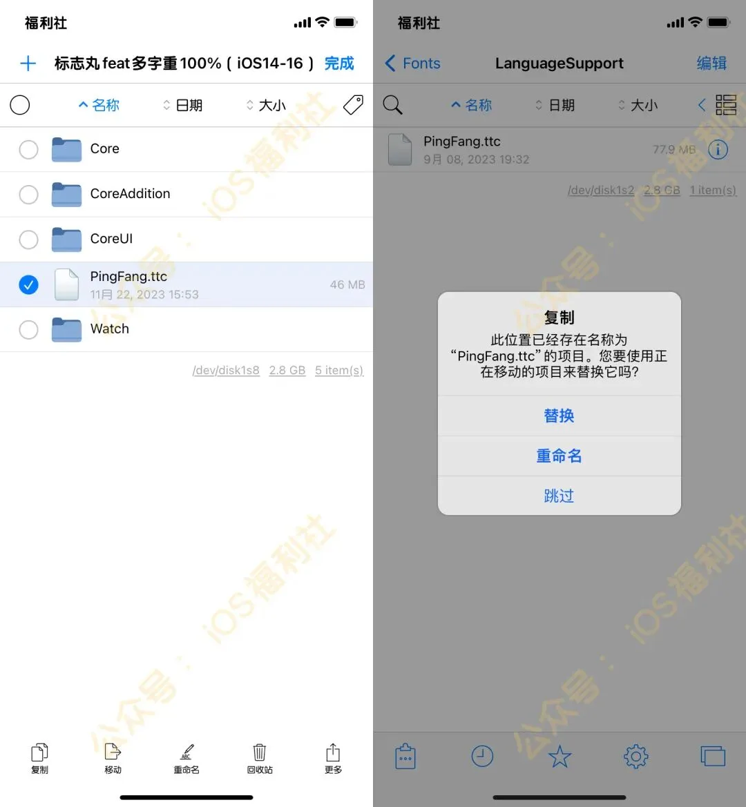 选择复制,然后打开var/containers/bundle/application/ .jbroot-xxxxx/mnt/System/Library/Fonts/LanguageSupport/,粘贴(替换)这里的PingFang.ttc 。