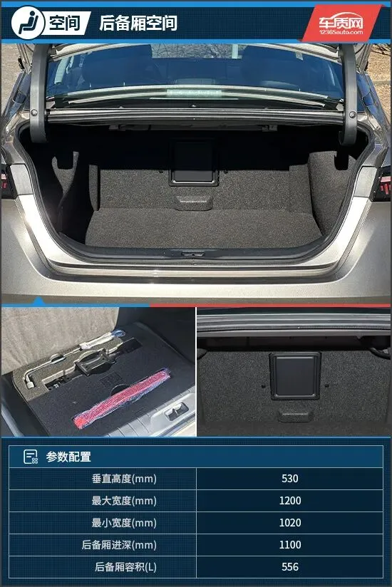 打开后备厢,内部十分规整,容积达到556L,可以放置4个登机箱,略有遗憾的是,评测车的后排座椅靠背不能放倒,空间扩展能力略显一般。