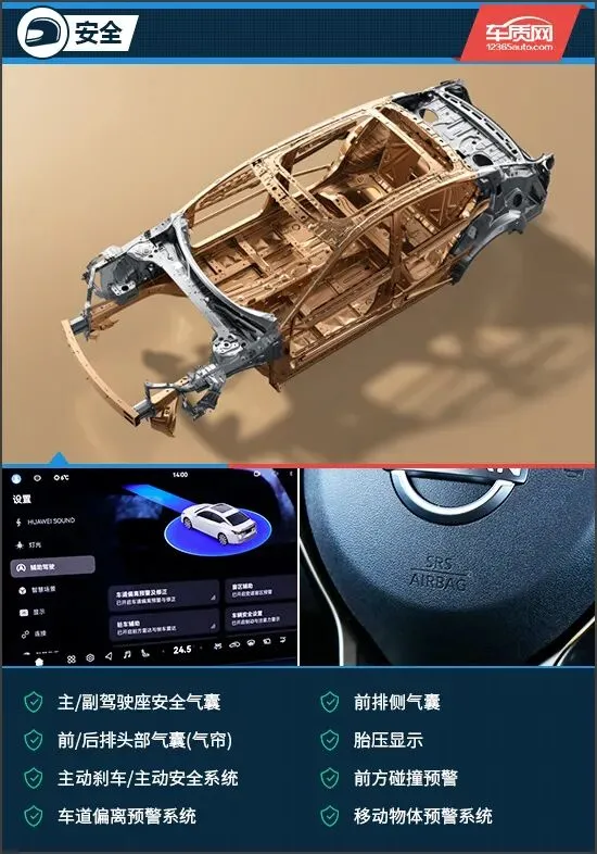 安全配置方面,评测车配备了较为完善的主/被动安全配置,包括主动刹车/主动安全系统、前方碰撞预警、移动物体预警系统、主/副驾驶座安全气囊、前排侧气囊等均没有缺席,整体表现出色。在看不到的地方,天籁·鸿蒙座舱的后防撞钢梁、A柱、B柱等核心骨架部位均采用超高强度钢,时刻守护全家人的安全。