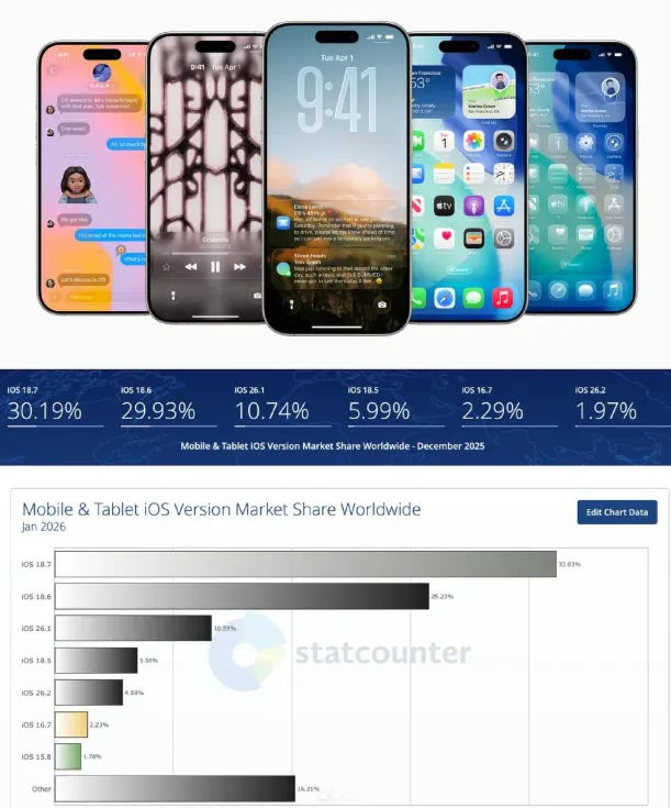 先来讲个数据,或许会叫不少人吃惊。iOS26正式推送都过了4个多月,可据StatCounter最新统计,全球仅有16%的iPhone用户升级到了这个系统。具体瞧瞧,iOS26.1占10.59%,26.2占4.58%,26.0就只有可怜巴巴的1.1%。