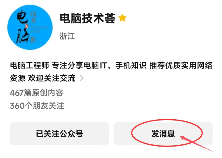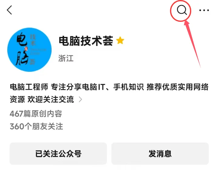 1、关注本号后,点击公号名称“电脑技术荟”,打开公号主页,点击右上角的搜索图标。