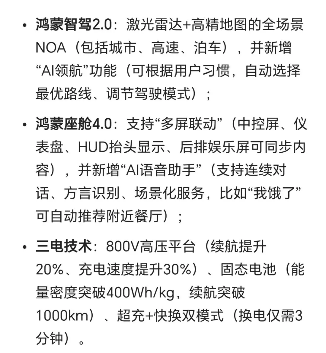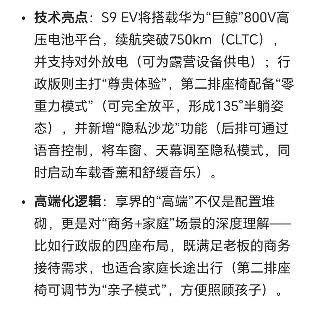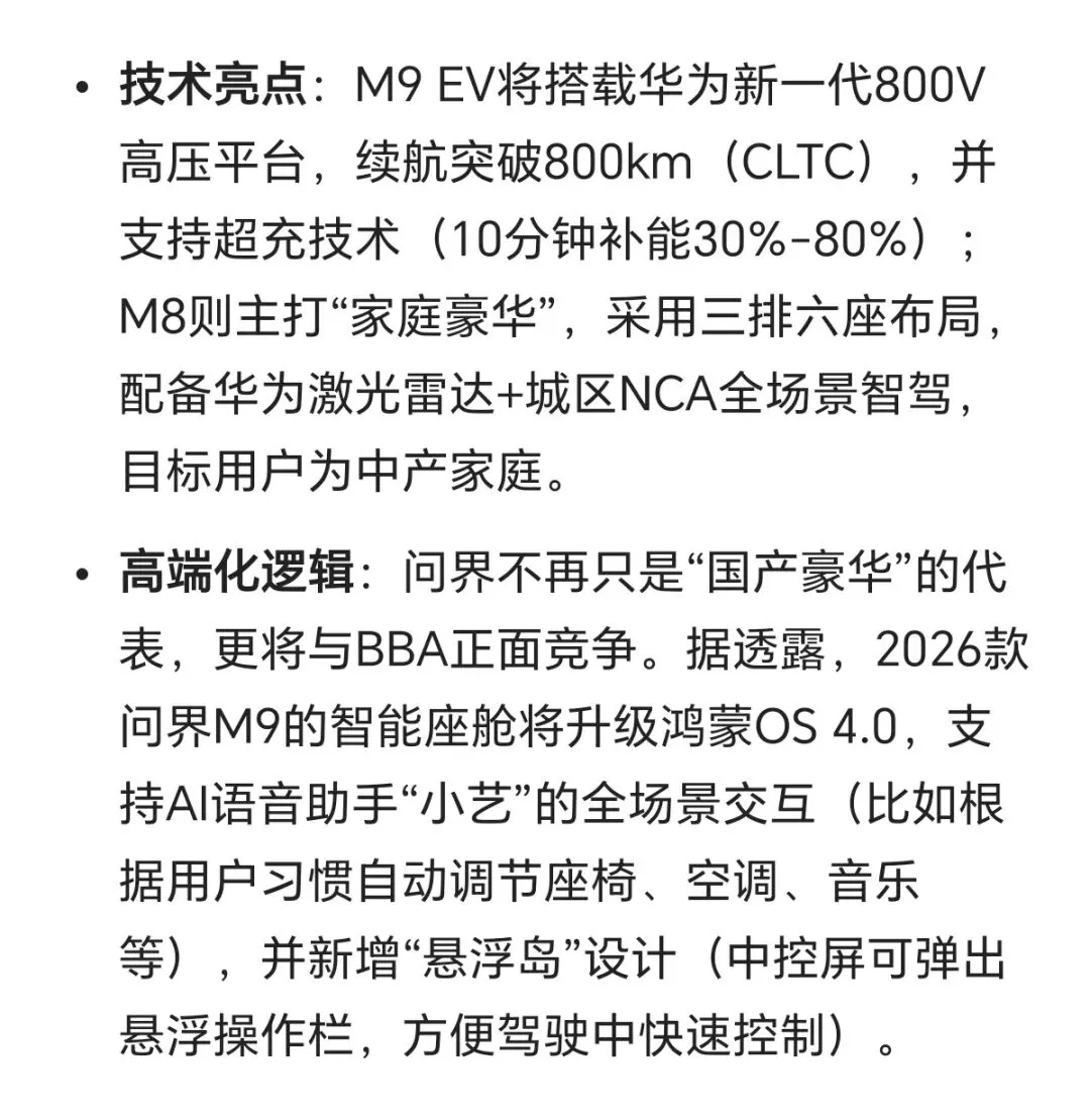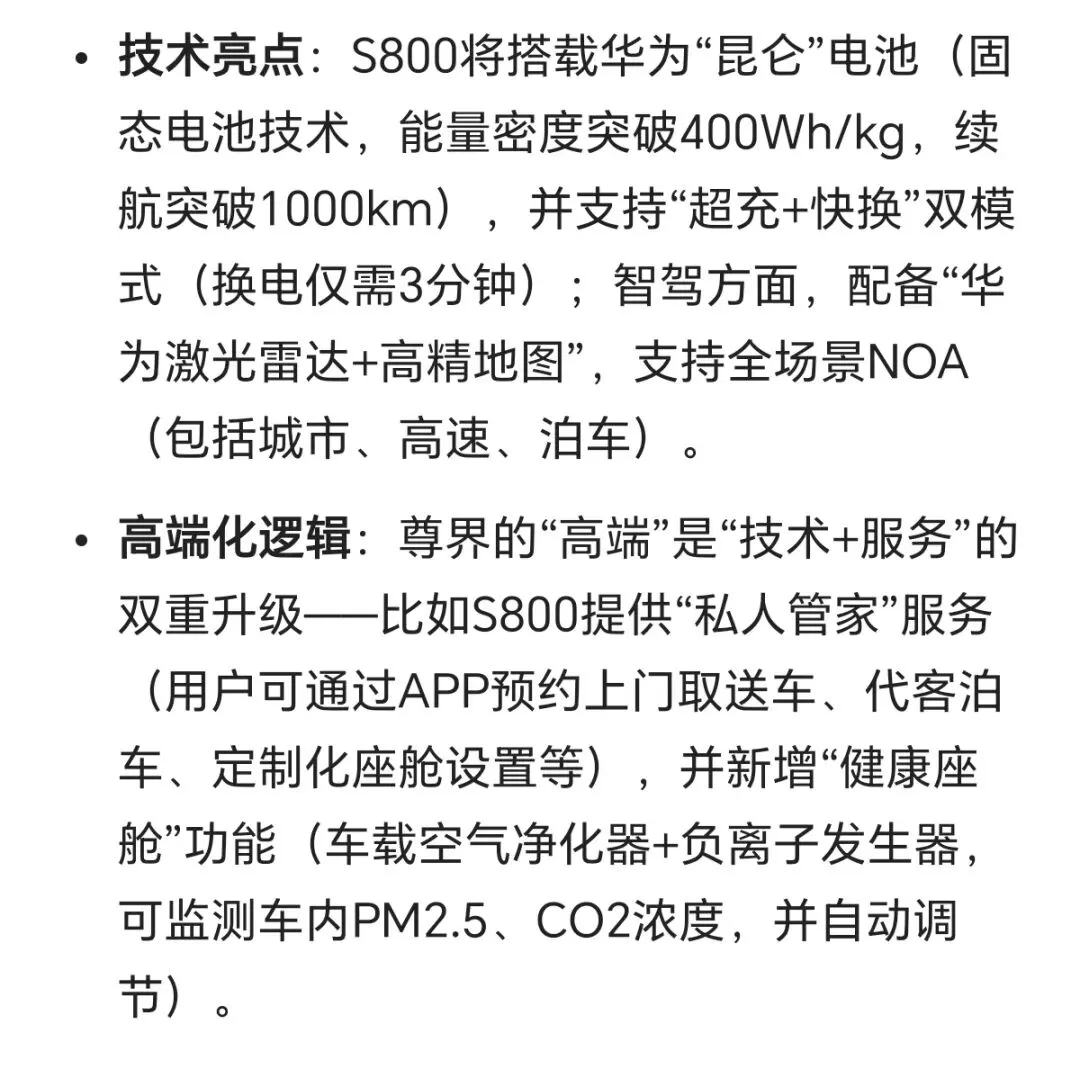 - 高端化:从问界M9到尊界S800,覆盖50万-100万+的全价格段,与BBA、保时捷等传统豪华品牌正面竞争;