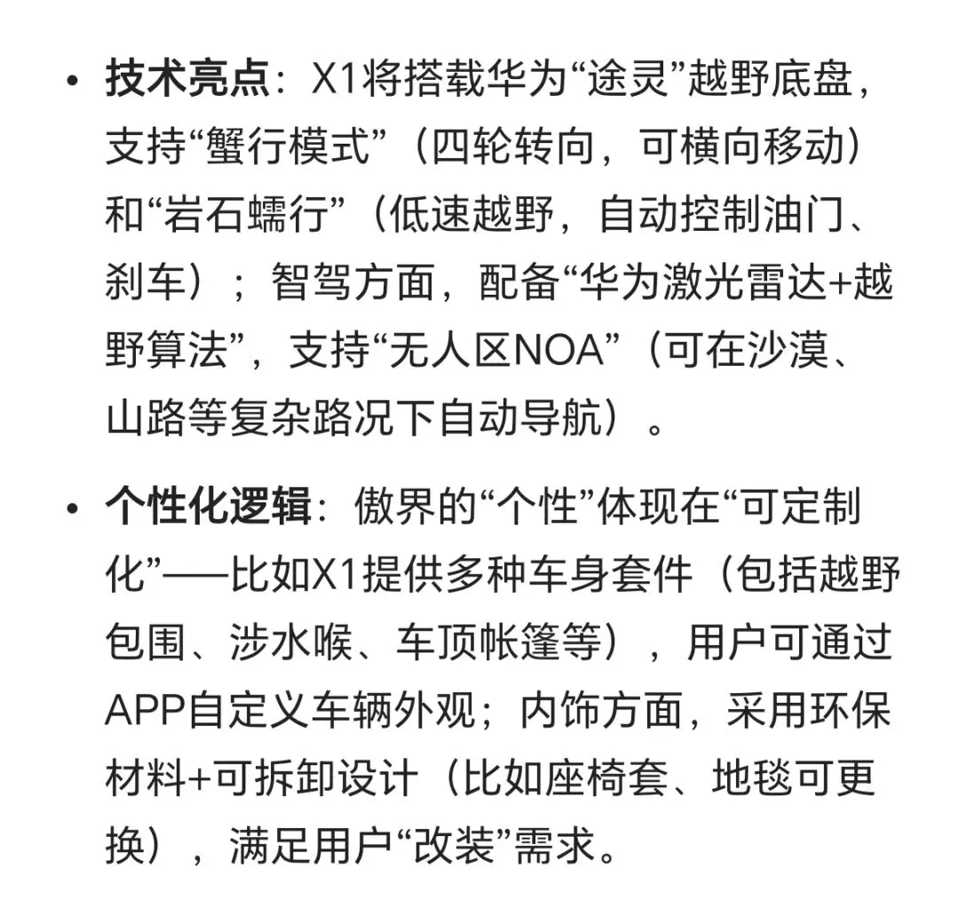 如果说前四个品牌是“高端化”的代表,那么2026年新推出的傲界则是“个性化”的先锋。傲界定位“个性豪华”,首款车型傲界X1(硬派越野SUV)将主打“越野+智能”的融合体验,目标用户为户外爱好者、改装玩家等小众群体。