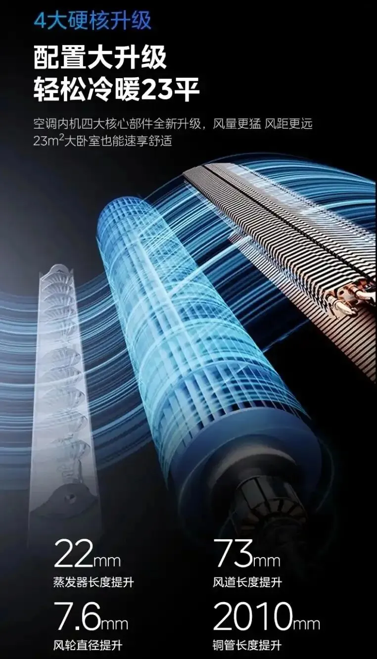 内机四大核心件全面升级:蒸发器加长22mm,风道延长73mm,风轮直径加大7.6mm,铜管总长更是增加了超过2米。
