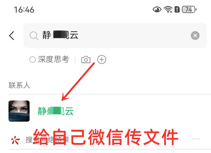 另外,我们在手机和电脑之间传输文件,也可以不用文件传输助手的,可以自己给自己微信发图片或文件,只需要点击右上角搜索图标,并输入自己的微信昵称,然后点击联系人下的自己微信即可,记得置顶该聊天哦。