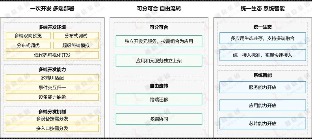 在万物智联的时代,鸿蒙系统的三大技术理念:一次开发,多端部署;可分可合,自由流转;统一生态,系统智能。
