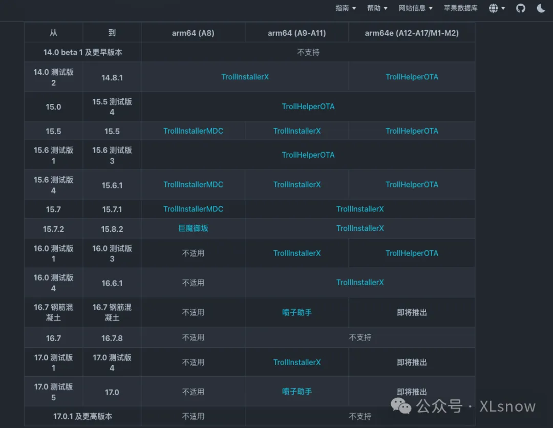 支持的设备arm64 (A8 - A11)目前只适配到iOS17.0,后续应该都可以arm64e (A12 - A17 / M1 - M2)支持 iOS14 – iOS16.6.1 & iOS17