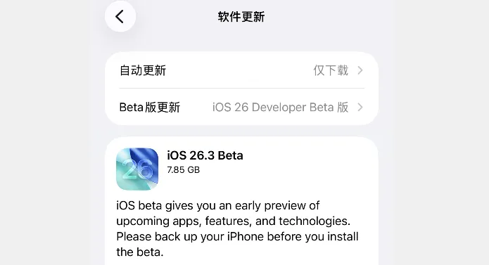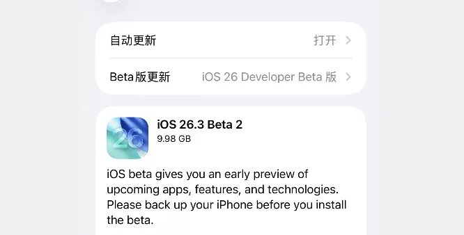 在 1 月 13 日上午 2 点整,苹果发布 iOS 26.3 beta 2 内测系统,该系统主要修复上个系统存在的问题,似乎对通知转发进行变更,有些设备可能不支持,还有控制中心动画貌似变了。