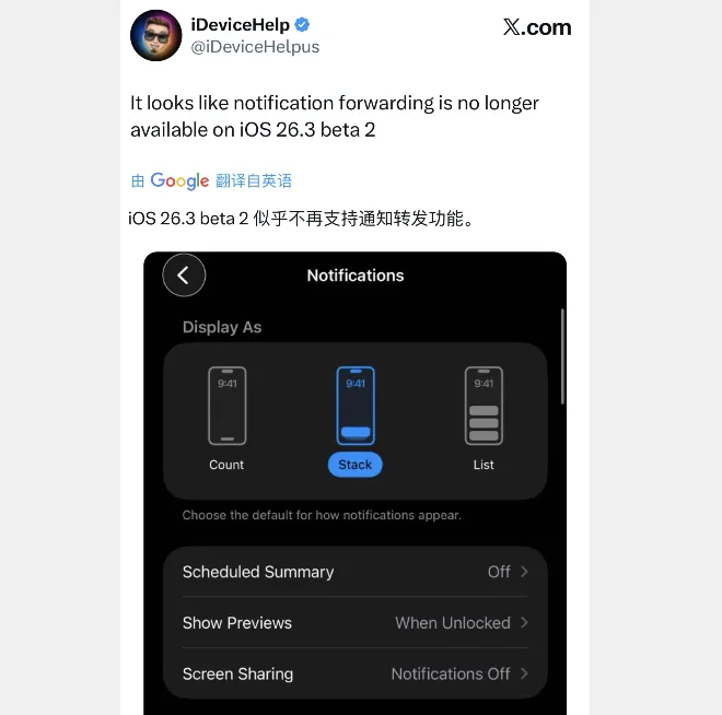 国外网友称,iOS 26.3 beta 2 版本似乎不再支持通知转发功能,如果你对此功能感兴趣的,暂不建议你们现在升级,耐心等等正式版发布。