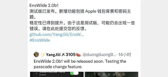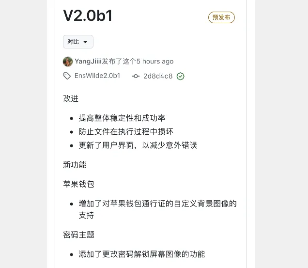 YangJiii 发布 EnsWilde 2.0b1 版本,卡包和密码修改上线。