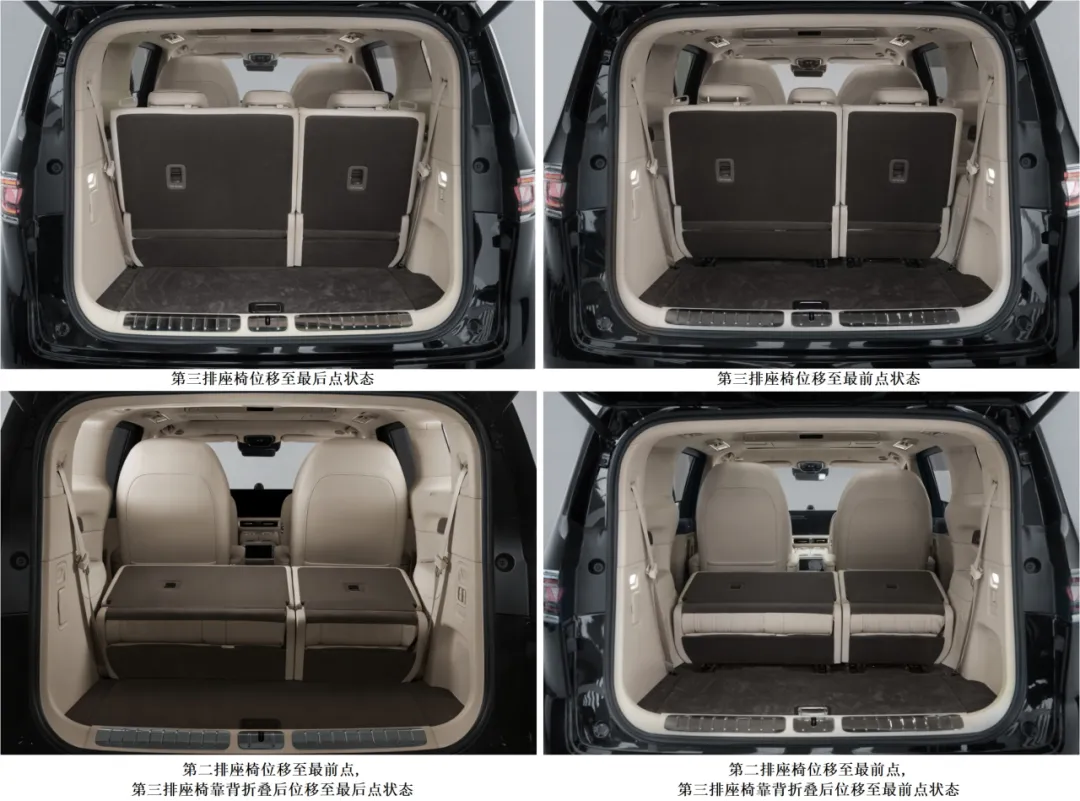 车身尺寸上,智界V9定位大型MPV,车身长度超5米,空间表现成为核心亮点。从后备箱展示图能清晰看到,第三排座椅支持前后移动,第二排座椅也可调整至最前位置,配合第三排靠背折叠功能,后备箱空间能实现灵活变换,无论是商务接待的体面感,还是家庭出行的实用性,都能兼顾。