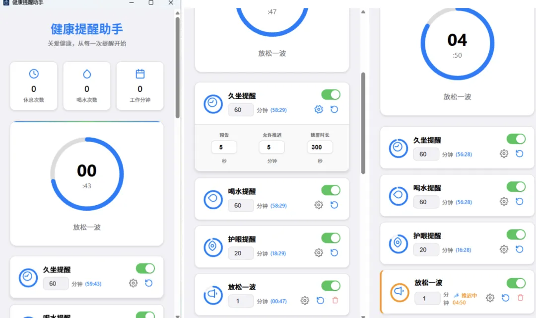 这是一个智能提醒助手,喝水 久坐 护眼等预防职业病的提醒功能,每个办公党都要装一个。win mac都支持。