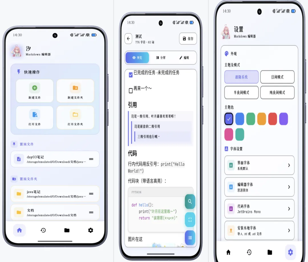 这是一款优雅的安卓端markdown编辑器。 它支持实时预览、多种主题配色和云同步功能,让写代码和笔记变得更高效舒适。内置插件系统,实现更多功能。经常在移动端办公的朋友,一定要试试。