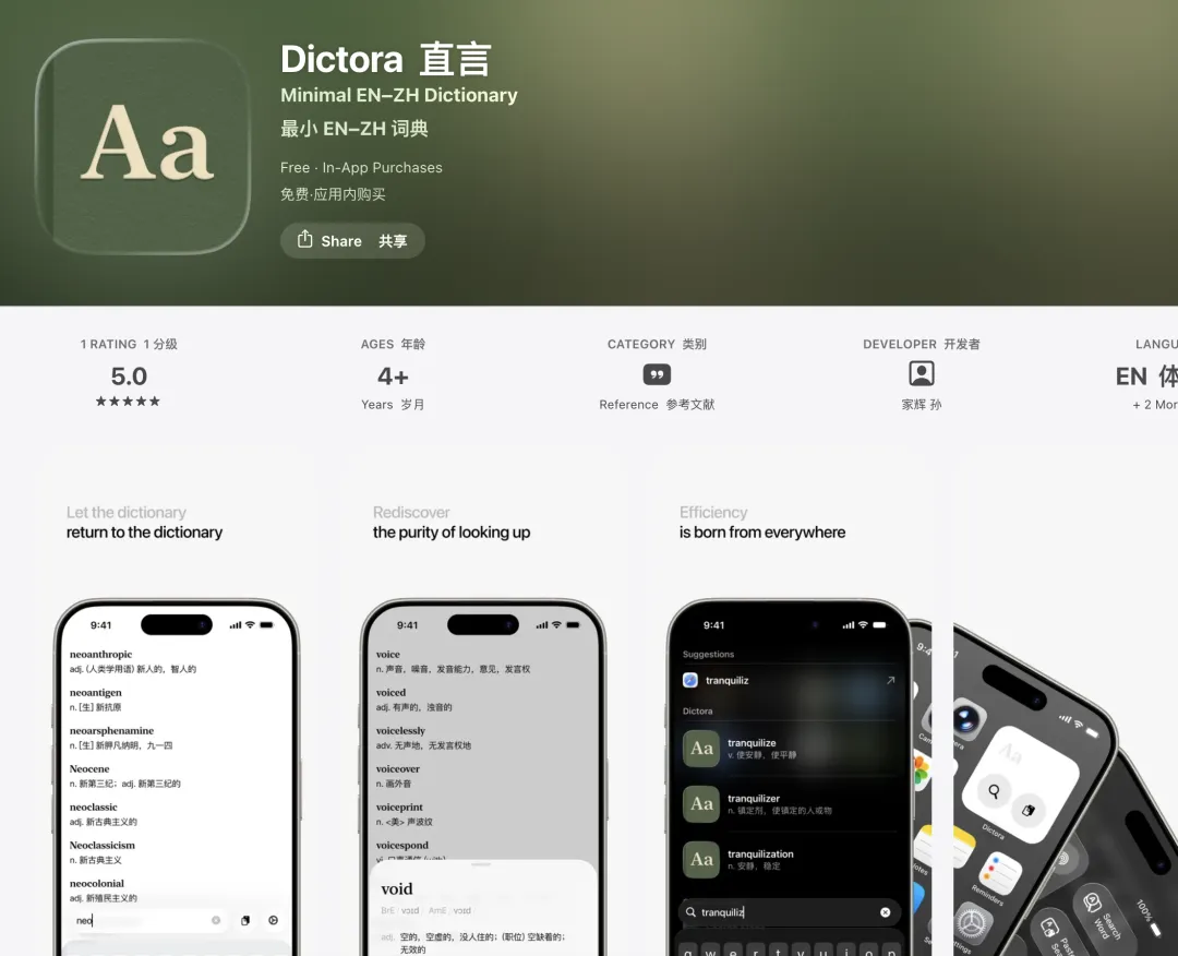 这是一款ios端极光词典的平替。极简视觉设计,内置本地词库,响应速度快,支持常用的spotlight和小组件入口查词。让每个单词即插即得。