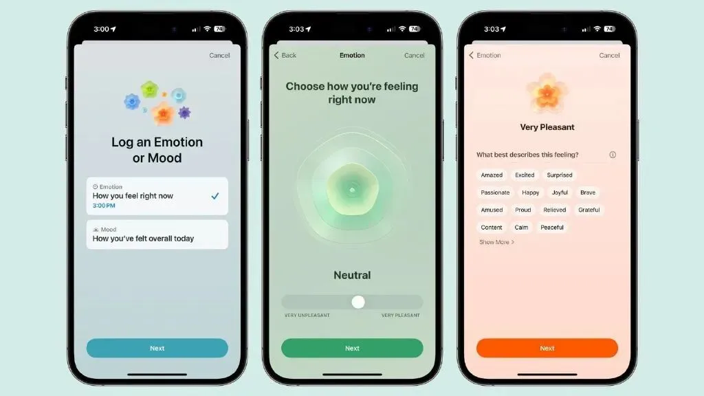 具体来说,用户进入情绪跟踪界面时有一个新图形,苹果进行了细节方面的调整,用不同的图形和颜色来表示每种情绪