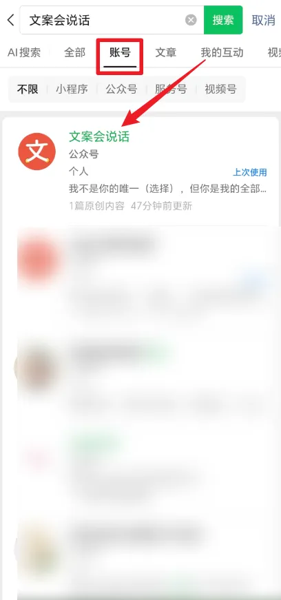 在搜索框内,输入【文案会说话】并进行搜索。在账号选项下,点击【文案会说话】并点击。