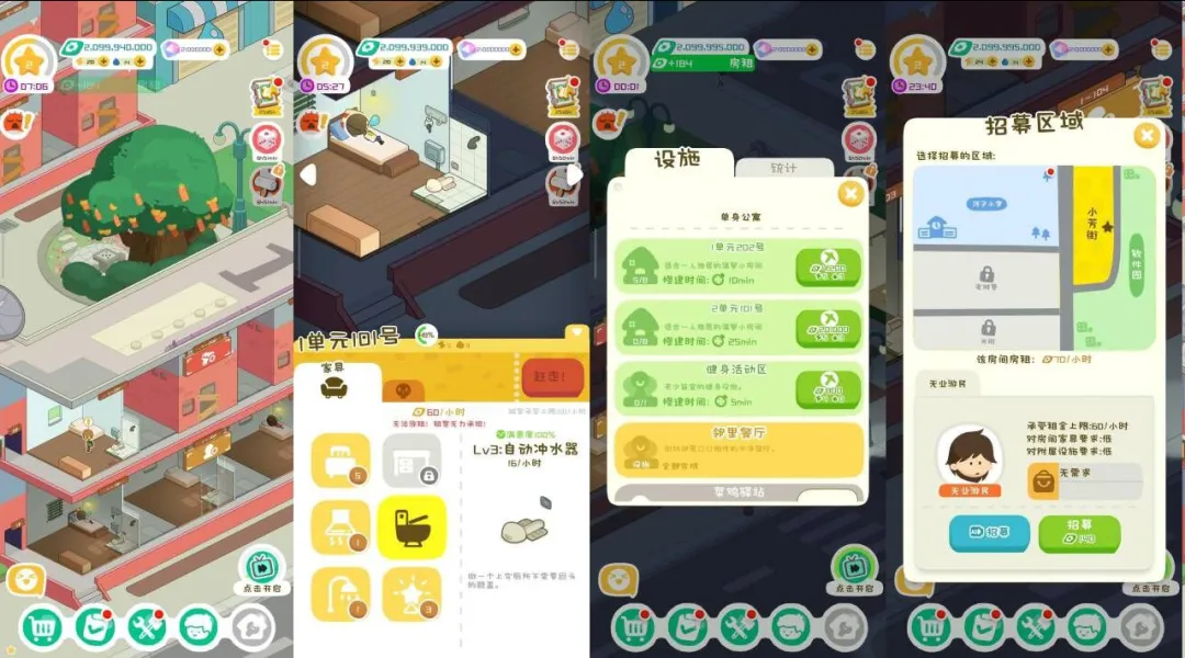 是一款超治愈的模拟经营手游!开局一栋楼,轻松当包租公/婆,从简陋公寓起步,自由装修房间、解锁海景别墅等多样房型,还能建设小卖铺、驿站等社区设施。游戏里有程序员、上班族等形形色色的租客,能听他们的生活碎碎念,帮着解决烦恼,甚至给租客减租送温暖。