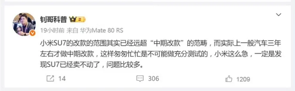 “小米SU7的改款的范围其实已经远超‘中期改款’的范畴,而实际上一般汽车三年左右才做中期改款,这样匆匆忙忙是不可能做充分测试的,小米这么急,一定是发现SU7已经卖不动了,问题比较多。”