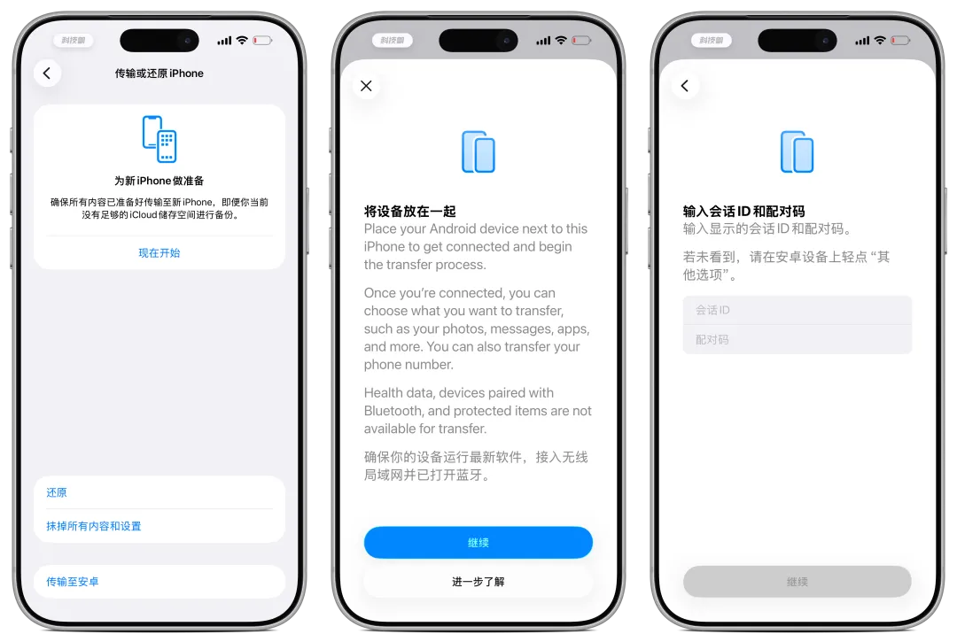 将 iPhone 与安卓设备放在一起后,通过扫描二维码或输入配对码的方式建立连接,从而将数据从 iPhone 迁移到安卓手机。当然,这一功能的前提是安卓系统本身也需要完成相应适配。