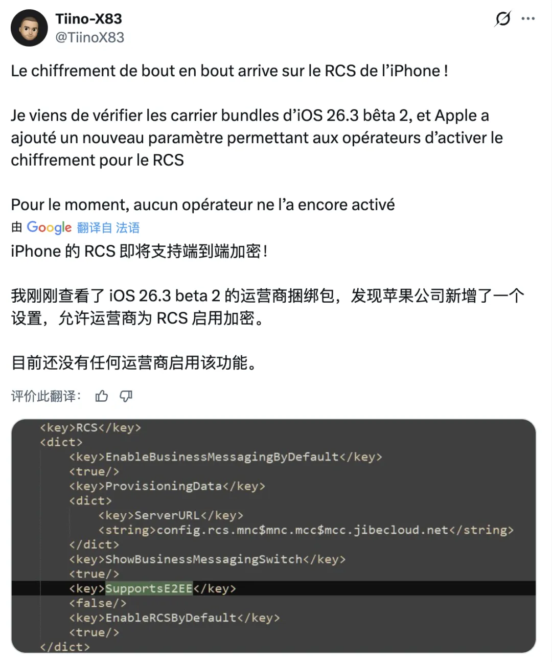 还有一项变化来自系统代码层面。早在去年 3 月,苹果就宣布将为 RCS 消息引入端到端加密(E2EE)支持。而在 iOS 26.3 Beta 2 的代码中,出现了新的运营商配置选项,允许运营商启用或关闭 RCS 消息的端到端加密。