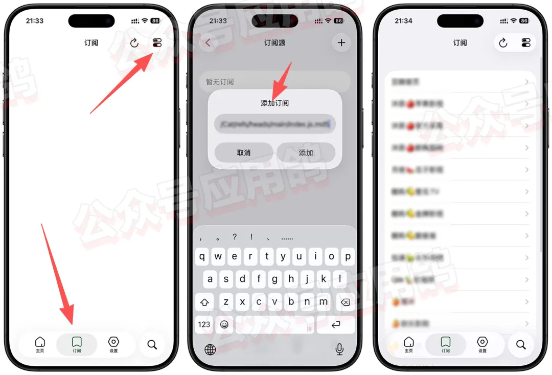 打开软件在首页点击底部的订阅,在点击右上角,点击加号,将订阅地址粘贴上去即可,订阅(文末获取)