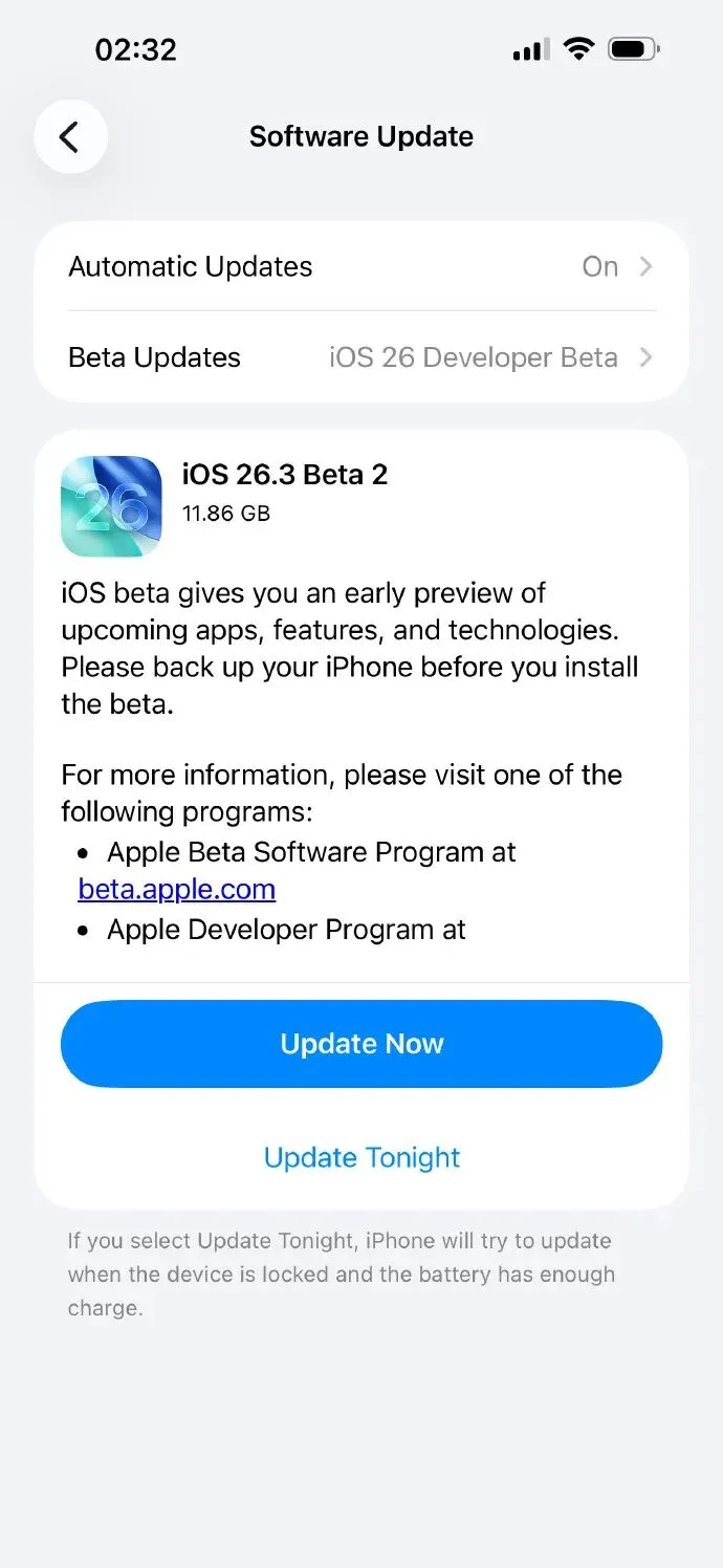 凌晨被苹果开发者频道的推送提醒吵醒,iOS和iPadOS 26.3开发者预览版Beta 2总算来了,内部版本号是23D5103d,距离上一版Beta 1刚好隔了28天。看这节奏,就是奔着1月27号正式版铺路的,全程以优化修复为主,没什么颠覆性新功能,但几个细节调整还挺实用,当然测试版该有的小毛病也没缺席,咱们结合实测慢慢唠。