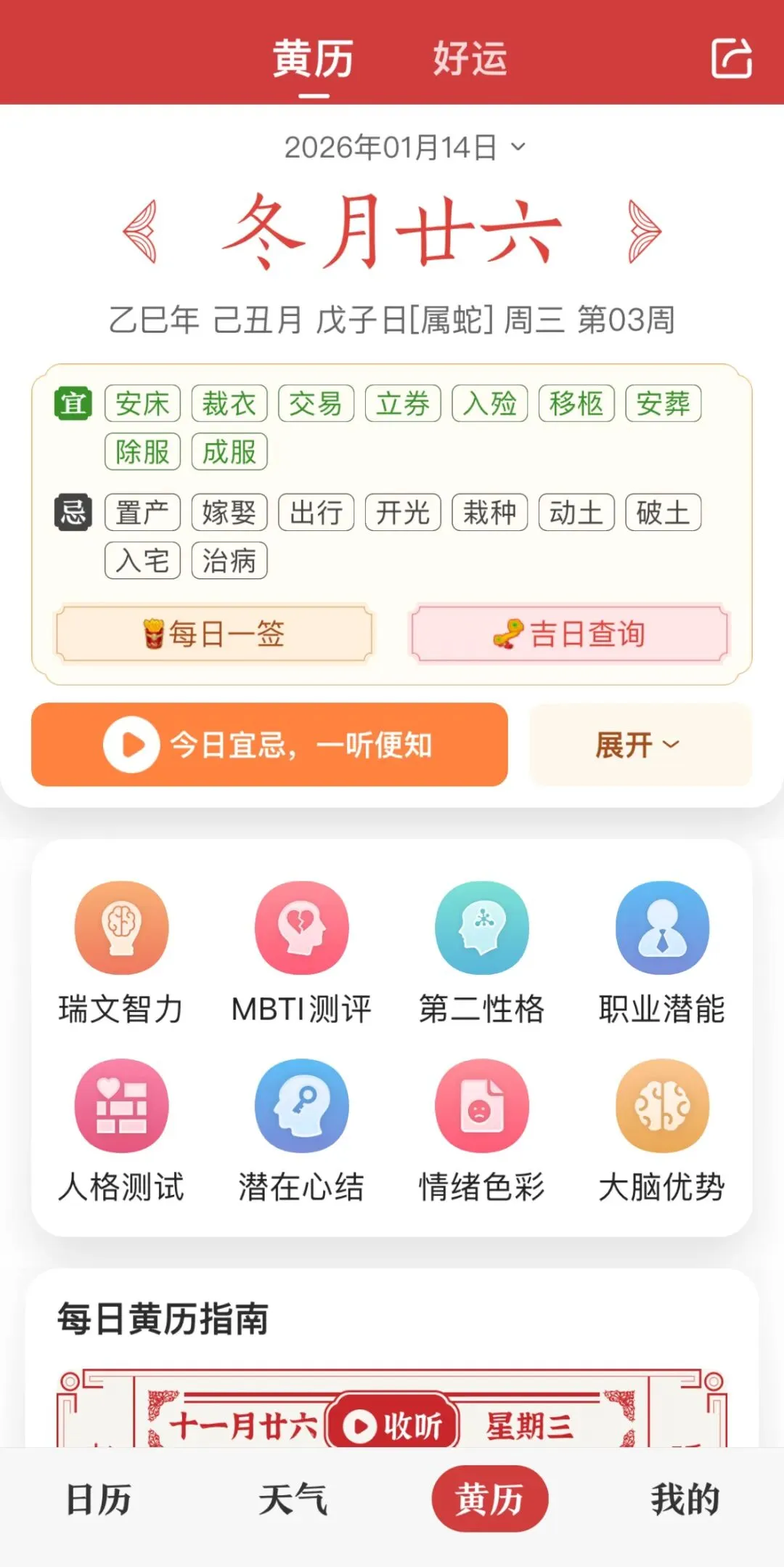 Hi,大家好我是约客。强大APP推荐第158期:一款中华传统日历APP,融贯古今智慧的生活指南。在快节奏的现代生活中,我们既需要精准的时间管理工具应对工作琐事,也渴望在传统智慧中寻找生活的仪式感与方向感。有这样一款APP,它打破了传统日历的功能边界,将三百年历法数据与现代生活服务深度融合,既是记录时光的载体,也是兼顾效率与温度的生活管家。从日常日程管理到传统民俗参考,从天气预警到个性阅读,它以全方位的功能覆盖,成为亿万用户手机中不可或缺的存在。