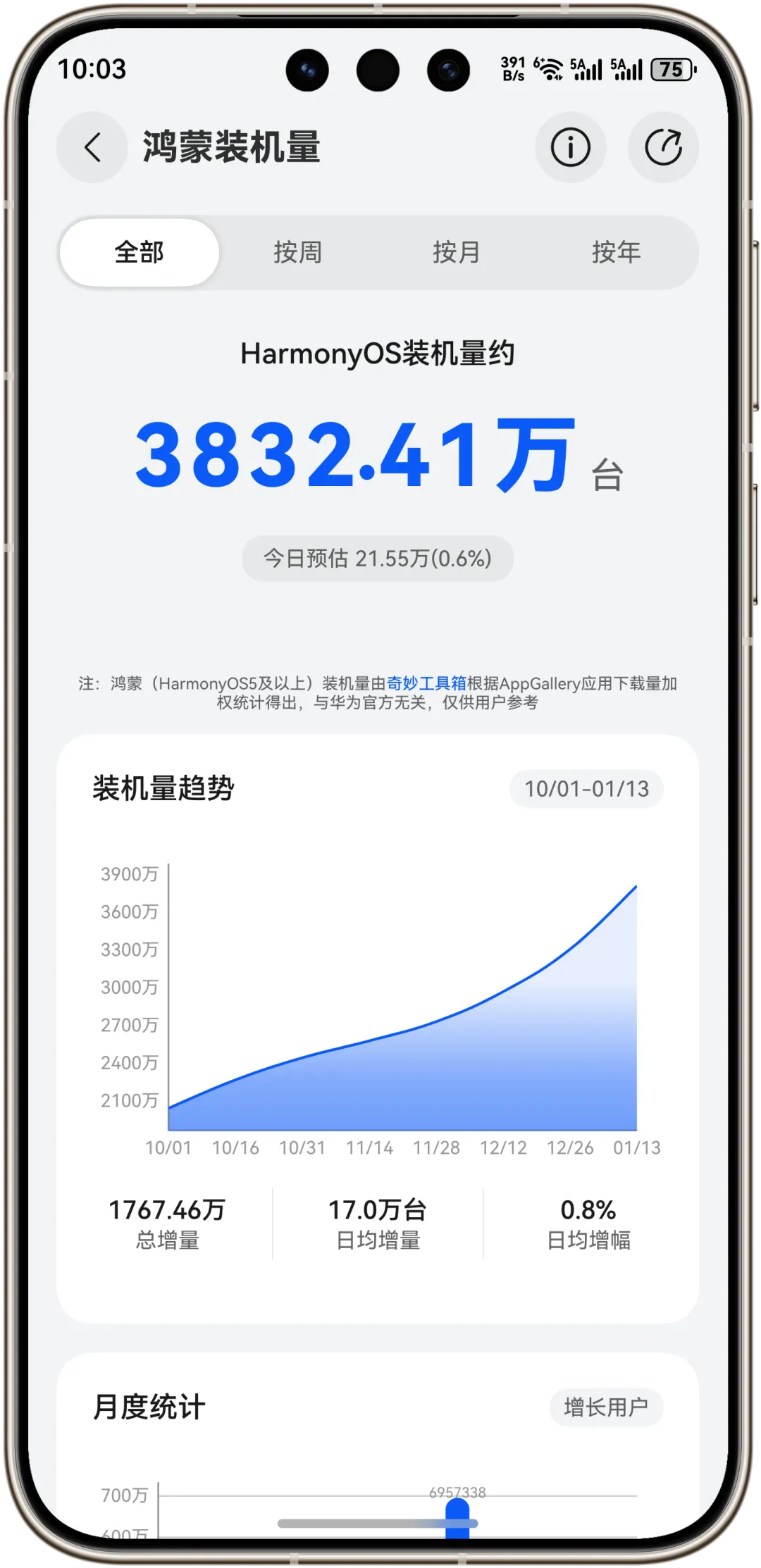 鸿蒙系统的装机量增长呈现出指数级跃升。截至2025年7月30日,搭载鸿蒙操作系统5的终端数量正式突破1000万。