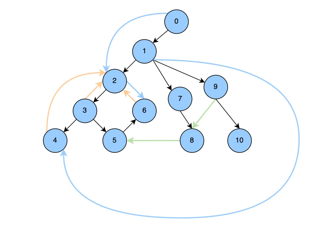 for (srcNodeOrdinal = 0; srcNodeOrdinal < nodeCount; ++srcNodeOrdinal) {firstEdgeIndex = nextNodeFirstEdgeIndex;nextNodeFirstEdgeIndex = firstEdgeIndexes[srcNodeOrdinal + 1];srcNodeIndex = srcNodeOrdinal * nodeFieldCount;for (int edgeIndex = firstEdgeIndex; edgeIndex < nextNodeFirstEdgeIndex; edgeIndex += edgeFieldsCount) {int index = edgeIndex + edgeToNodeOffset;if (isValid(index, edges.length)) {int toNodeIndex = edges[index];if (toNodeIndex % nodeFieldCount != 0) {TBPLogger.error("Invalid toNodeIndex is {}.", new Object[]{toNodeIndex});} else if (isValid(toNodeIndex / nodeFieldCount, firstRetainerIndex.length)) {//retainningNodes的起点int firstRetainerSlotIndex = firstRetainerIndex[toNodeIndex / nodeFieldCount];//由后向前添加,直到retainingNodes[firstRetainerSlotIndex]变为了0int nextUnusedRetainerSlotIndex = firstRetainerSlotIndex + (--retainingNodes[firstRetainerSlotIndex]);if (isValid(nextUnusedRetainerSlotIndex, retainingNodes.length) && isValid(nextUnusedRetainerSlotIndex, retainingEdges.length)) {retainingNodes[nextUnusedRetainerSlotIndex] = srcNodeIndex;retainingEdges[nextUnusedRetainerSlotIndex] = edgeIndex;}}}}}
