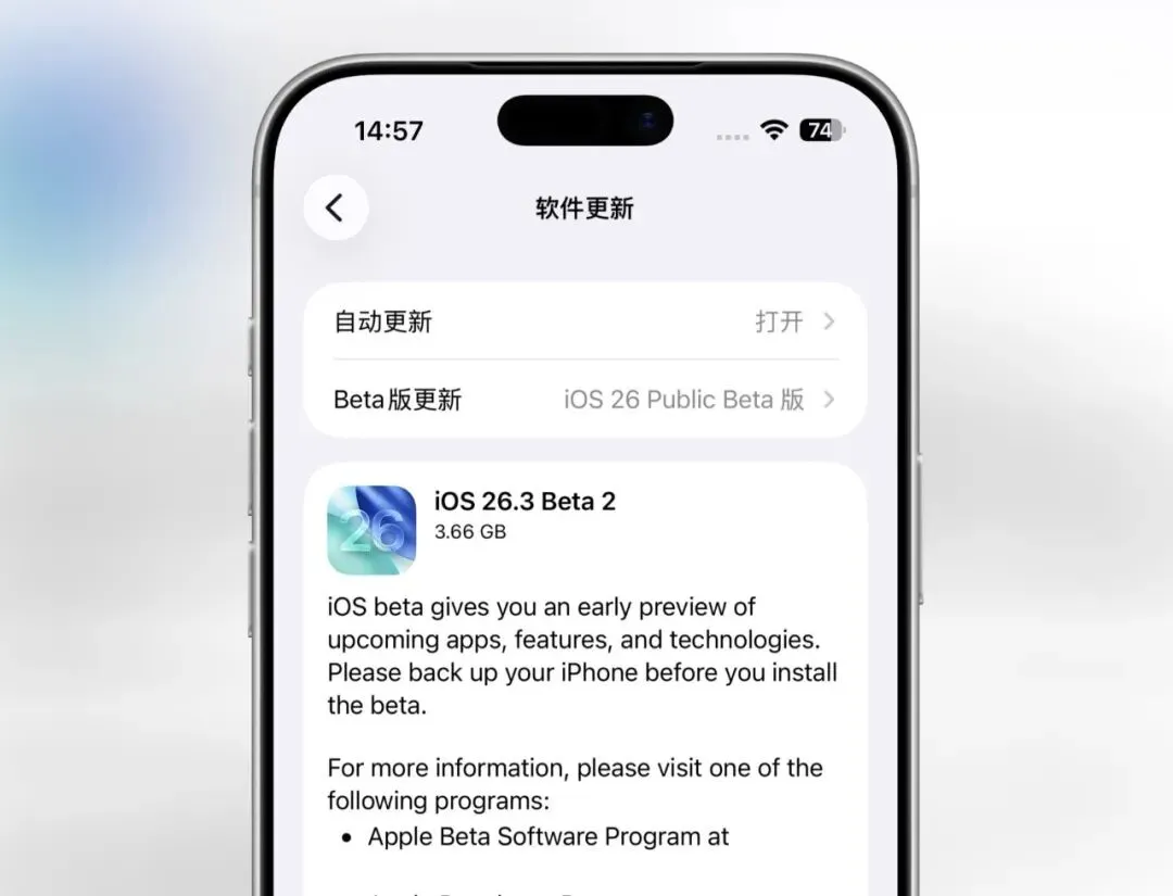 在 iOS 26.3 Beta 2 开发者预览版发布后,今天苹果按照惯例给公测用户推送了:■ watchOS 26.3 Beta 2 公测版■ visionOS 26.3 Beta 2 公测版iOS 26.3 Beta 2 公测版的版本号和开发者预览版保持一致,更新内容也是一致的,主要是安全性修复,没有带来新功能。同时在 iOS 26.3 Beta 1 中新增的「通知转发」功能,在 iOS 26.3 Beta 2 已经被取消了。2026最全的手机报价,最新iphone新闻请关注雅妹儿微信号:1018817036 <--- 长按可复制到微信添加关注