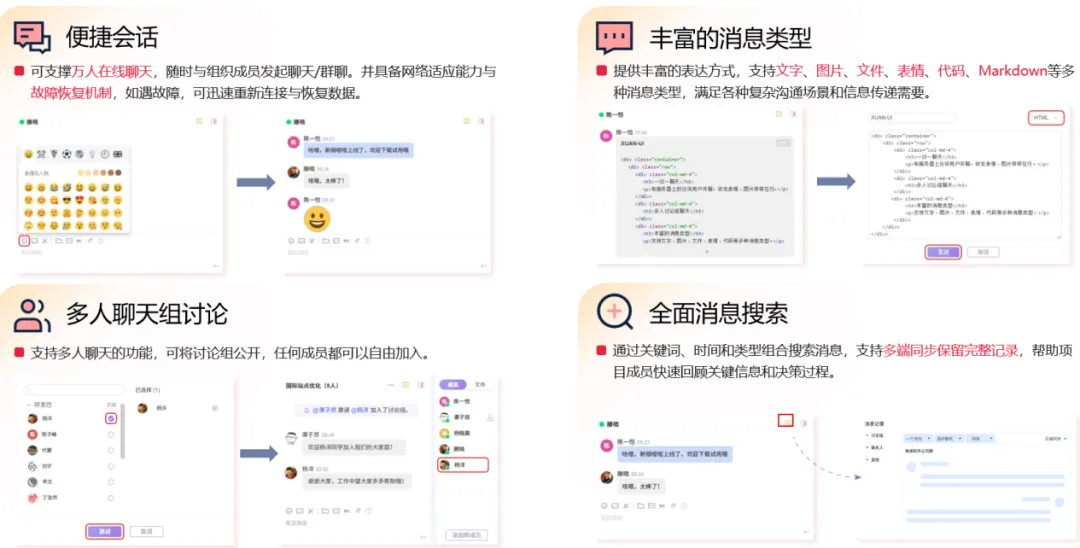 •选型标准:软件必须具备强大的集成能力,能够将研发管理、OA 审批、ERP 预警等业务数据以结构化形式接入对话框,实现“消息即业务”。特别是对于技术型集团,与项目管理工具的底层打通是效率翻倍的关键。