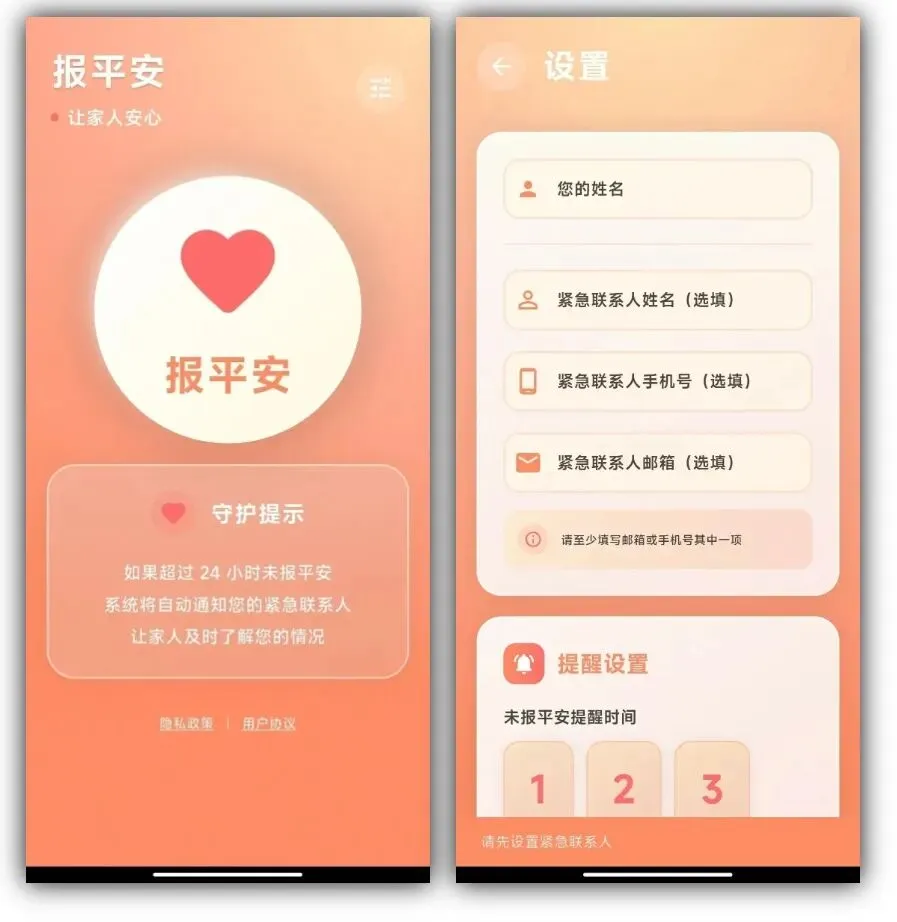这款软件的使用方式比较直接:需要打卡报平安。如果你超过 24 小时没有打卡,系统就会自动通知你的紧急联系人,包括发送短信和拨打电话。你也可以自己设置未报平安的提醒时间,比如 1 天、2 天或 3 天。只要按时报平安,就能让家人知道老人目前是安全的。