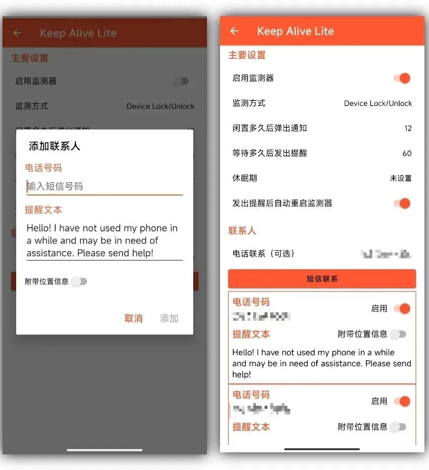 Keep Alive 是一款开源免费的安卓 APP,功能上有点类似苹果端的“死了么”。它最大的特点就是:不用签到,但如果你在设定的时间内没有打开软件,它就会自动给你指定的紧急联系人发短信、打电话。