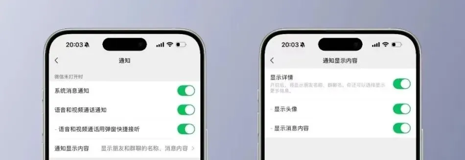 不过,如果担心这一功能会泄露隐私,用户可以在 设置 -> 通知 -> 通知显示内容 中关闭头像显示、消息内容等。
