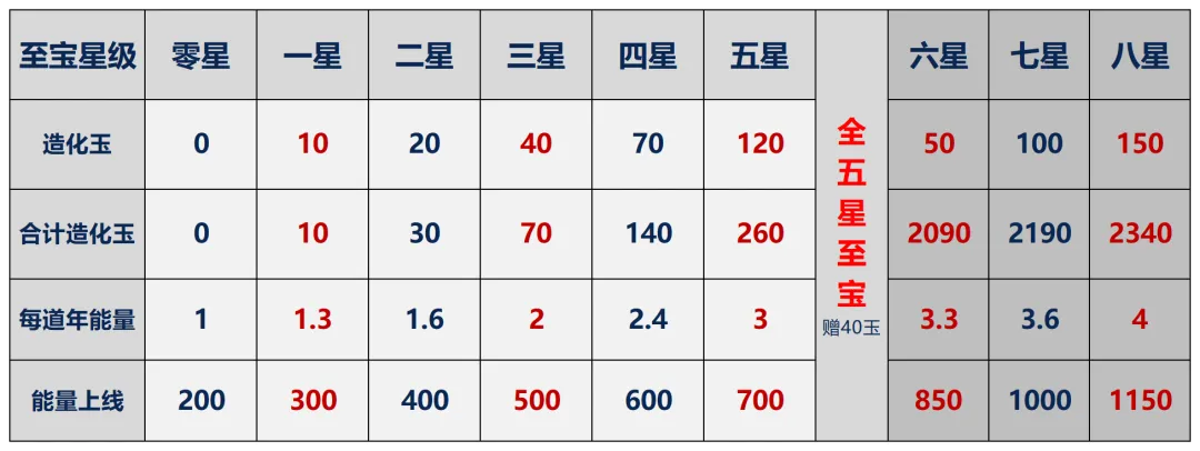 作为游戏中顶级道具,必然是游戏中的八大造化至宝了,当然获取易,培养难,造化至宝,难就难在造化二字。获取至宝,对于欧皇来说可以说一张月卡或者是一张机缘巧合之下的一张造化图就足够了,而后续的培养升星至宝则难如登天,目前游戏除了第一人之外没谁敢说自己绝对溢出。下面给大家说下游戏中定位最稀缺的资源-鸿蒙造化玉的途径以及如何高效获得!首先是造化至宝升星需要的造化玉,具体可以看下图所示,一个五星所需的造化玉为260造化玉,对于众多平民玩家来说,至宝能到三星已经是天花板了,而五星更是可望而不可及,至于八星至宝则只在遥远的传说中!