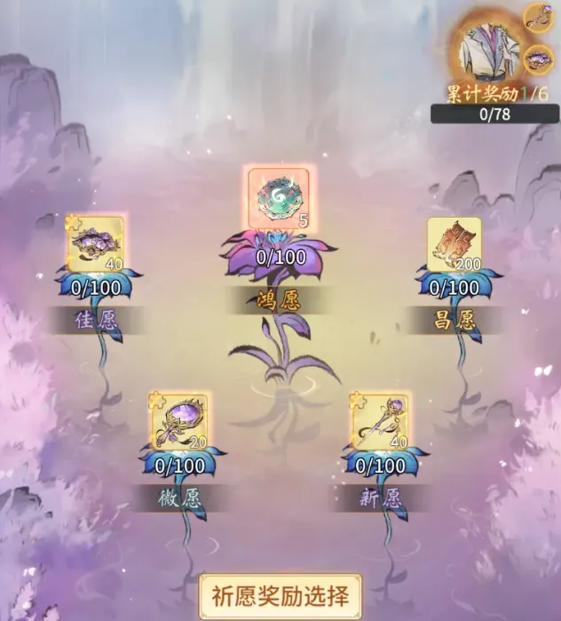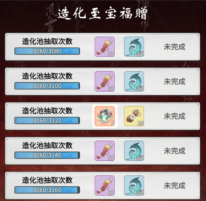 祈愿:与转盘类似,只不过玩法不同,也是选择奖励进行抽奖,根据抽奖次数获得轮次奖励,一般会投放古宝套,并且造化玉数量根据5~30个左右。