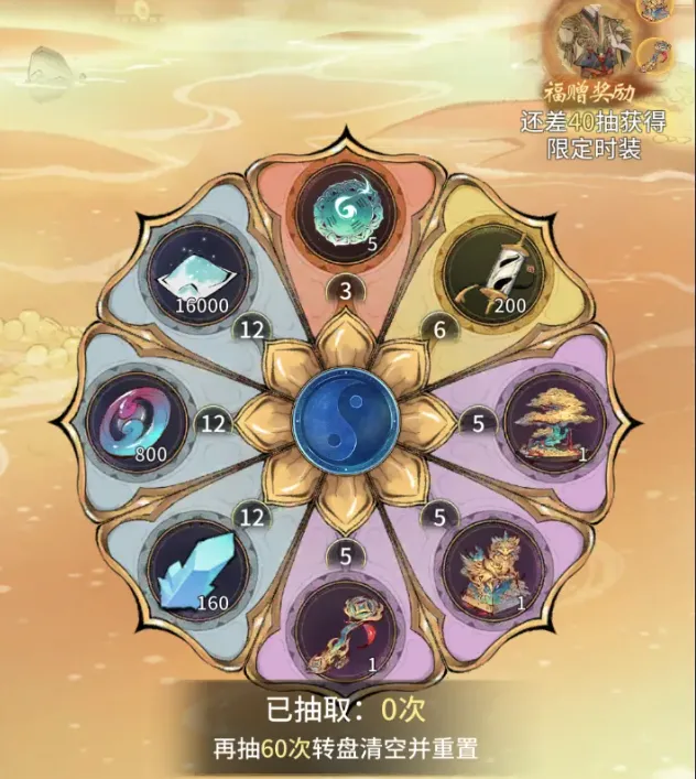 转盘:选择奖励进行抽奖,根据抽奖次数获得轮次奖励,一般会投放古宝套,并且造化玉数量根据5~30个左右。