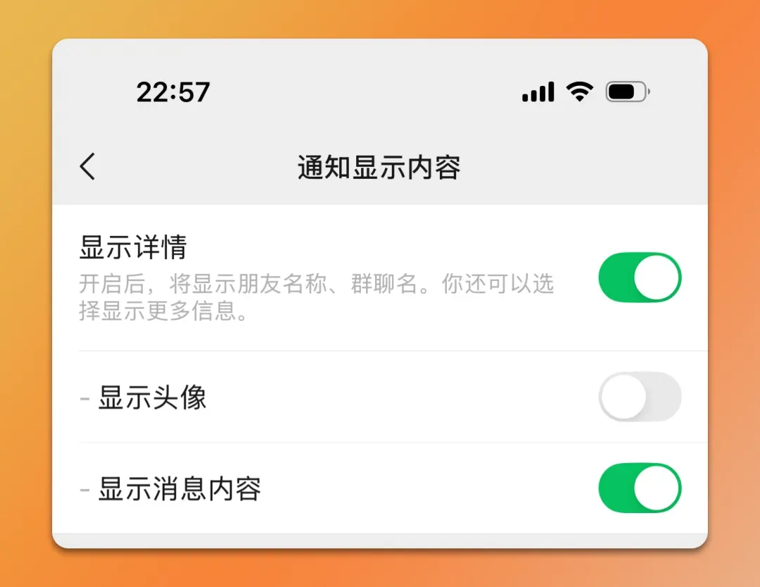 感觉还蛮实用的,如果多个好友同时发来消息可以快速区分。需要将微信更新至 8.0.67 版本,目前这个功能灰度内测范围扩大了,并且可以在通知显示内容进行设置是否开启。