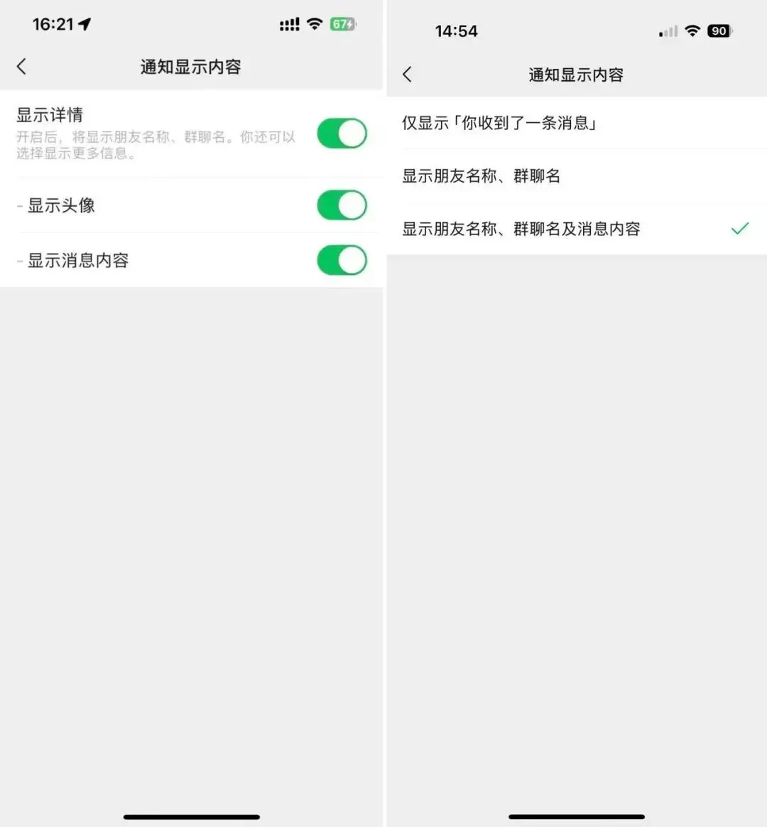 在微信「我-设置-通」中,「通知显示内容」选项中的设置内容有非常大的变化,具体变化如下图所示,最大的变化就是新增了「显示头像」开关,开启后,收到微信通知消息上会显示头像。