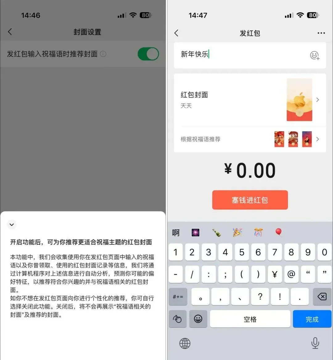 在「封面设置」中带来了「发红包输入祝福语时推荐封面」开关选项,开启后,微信会收集用户在发红包页面中输入的祝福语以及曾领取、使用的红包封面记录等信息,推荐相关的红包封面。