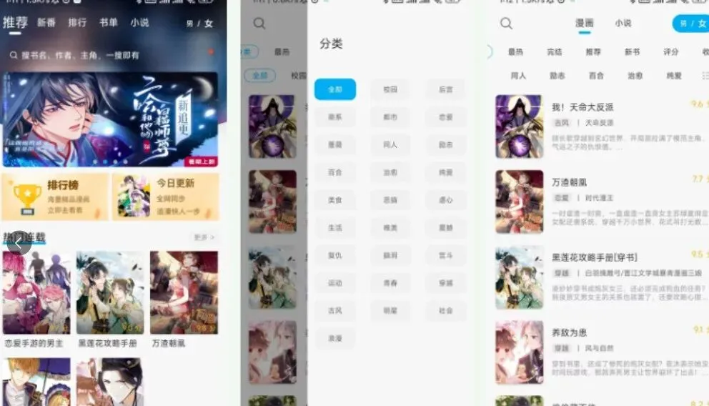 这款漫画比较适合女生,上面的漫画作品也非常不错,励志、百合、纯爱、同人等等,体验感非常流畅,有很多其他平台没有的资源。而且,这款app上面还有小说频道,除了看漫画之外,偶尔看一下小说也是挺不错的