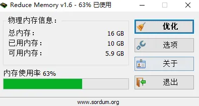第二款:ReduceMemoryReduceMemory压缩后992K,小巧得很。打开能看到内存信息,点击【优化】释放内存。设置里能设定阈值自动优化,也能设置间隔时间清理,简单方便。