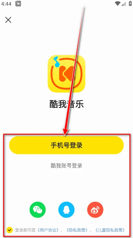 1.首先请在本站下载安装最新版本的酷我音乐,点击手机号登录,接着勾选登录即同意《用户协议》、《隐私政策》、《儿童隐私政策》。