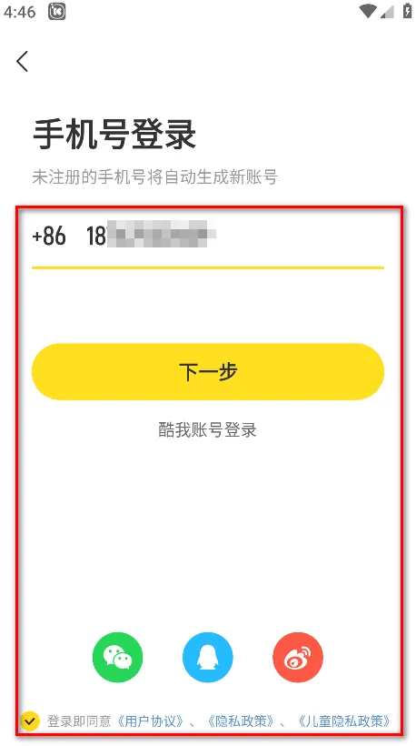 2.输入手机号码,点击下一步,然后勾选登录即同意《用户协议》、《隐私政策》、《儿童隐私政策》。