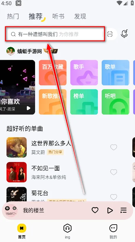 5.接着在首页上方的搜索框输入关键字即可找到我们喜欢的歌曲。